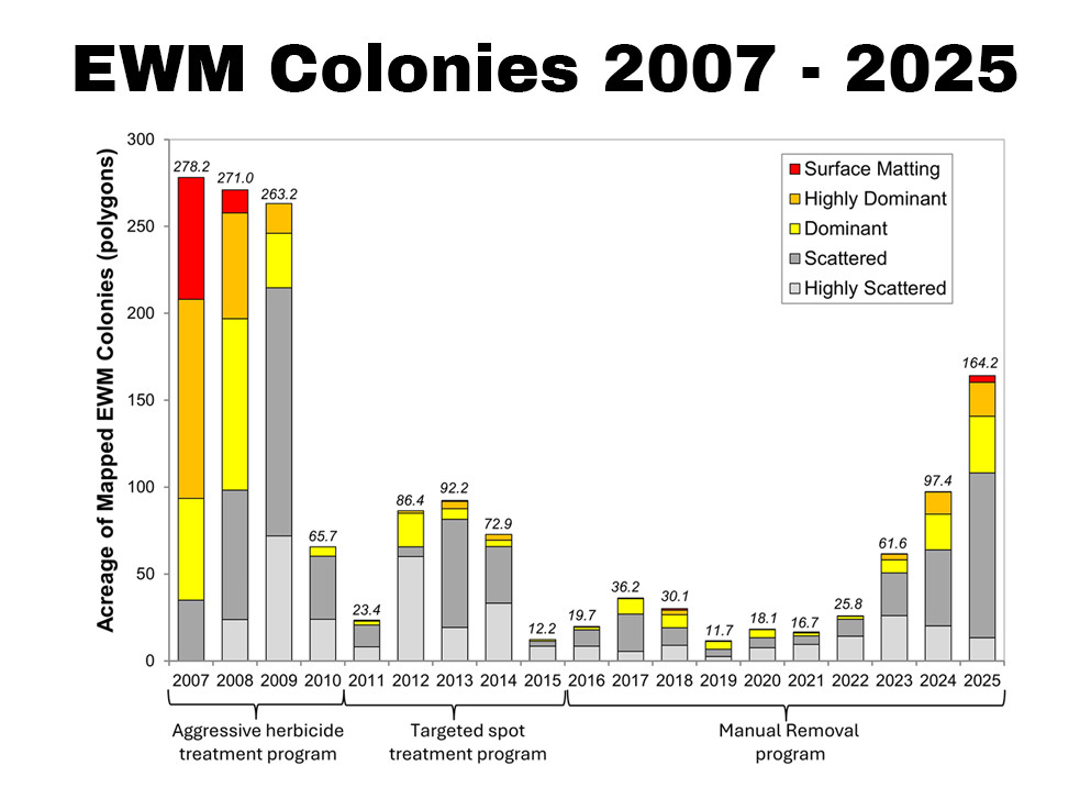 It took 8 years of herbicide management to bring the milfoil down to a manageable level. The goal of management strategy has shifted from substantial population reduction to containing and maintaining the population at a low, suppressed, level of occurrence.