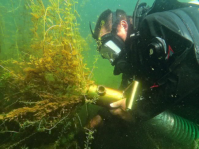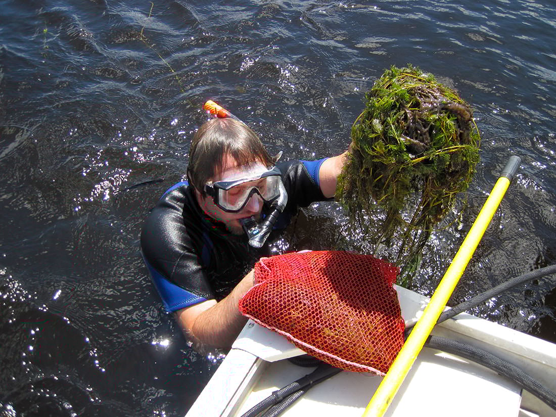 Hand removal of invasive plants is the most intuitive of control methods. It is labor intensive as it involves removing and bagging the entire plant by hand. During hand harvesting, divers manually remove milfoil plants from the lake bottom, with care taken to remove the entire root crown and not to create fragments. This method is suitable for very early infestations of milfoil and for follow-up removal after herbicide treatments
