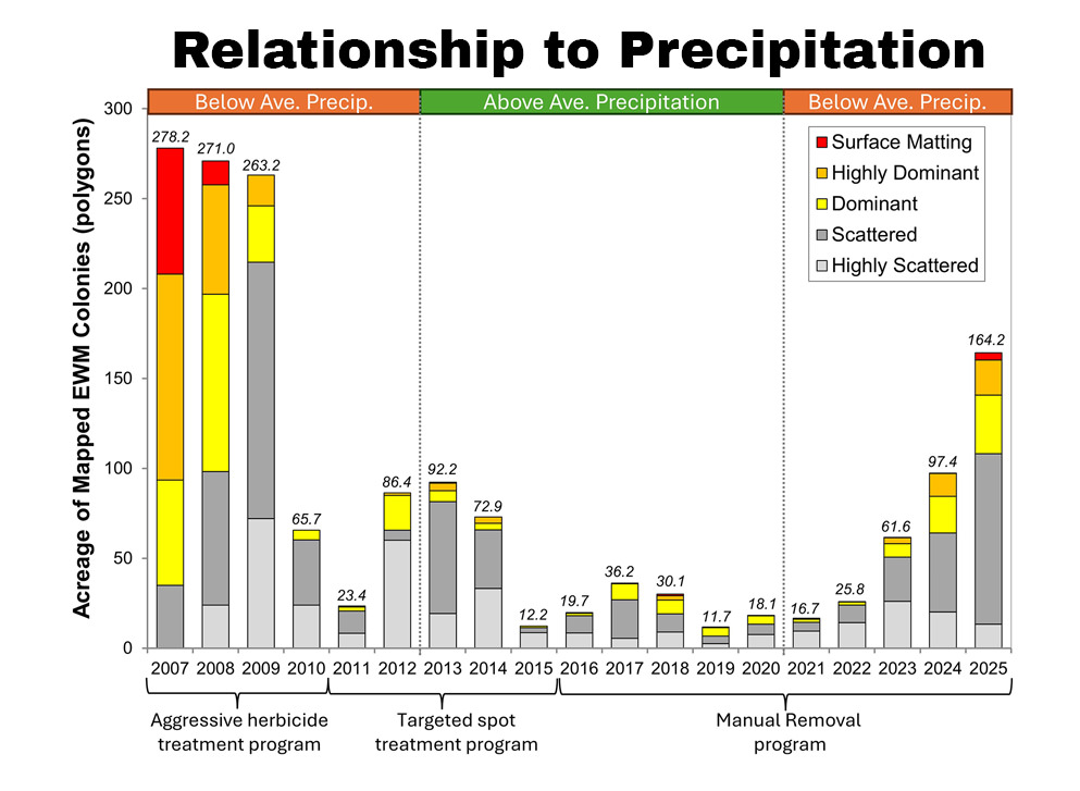 Treatment on the Eagle River Chain has been extremely successful in terms of controlling the density and occurrence of EWM. Over the course of the EWM management program from 2008 to 2021, EWM acreage has been reduced from 278 acres in 2007 to a low of 11.7 acres in 2019. Since 2021, there has been a moderate and consistent increase in the amount of EWM, with 164 acres in 2025.  There is also an apparent correlation with the amount of precipitation, as illustrated in the chart below.